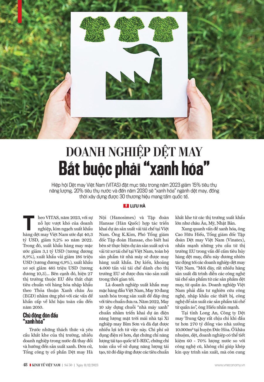 Theo VITAS, năm 2023, với sự nỗ lực vượt khó của doanh nghiệp, kim ngạch xuất khẩu hàng dệt may Việt Nam ước đạt 40,3 tỷ USD, giảm 9,2% so năm 2022. Trong đó, xuất khẩu hàng may mặc ước giảm 3,1 tỷ USD (tương đương 8,9%), xuất khẩu vải giảm 186 triệu USD (tương đương 6,9%), xuất khẩu xơ sợi giảm 485 triệu USD (tương đương 10,3)… Bên cạnh đó, hiện 27 thị trường thuộc EU đều thắt chặt tiêu chuẩn với hàng hóa nhập khẩu theo Thỏa thuận Xanh châu Âu (EGD) nhằm ứng phó với các vấn đề khẩn cấp về khí hậu toàn cầu đến năm 2050.