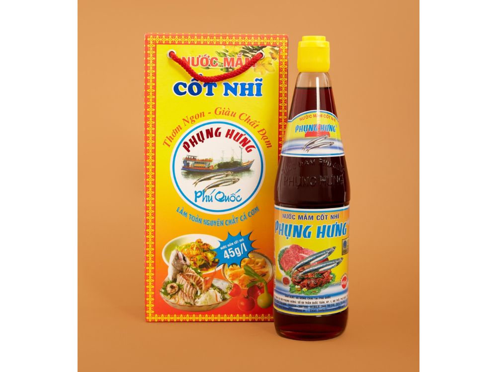 Nước mắm cốt nhĩ 45 độ đạm: là loại nước mắm truyền thống cao đạm nhất và đặc biệt nhất tạo nên tên tuổi, sự nổi tiếng của thương hiệu nước mắm Phụng Hưng. Để cho từng giọt nước mắm nhĩ 45 đạm, cá cơm sau khi muối phải được ủ chượp từ 12-15 tháng và quy trình sản xuất hoàn toàn bằng thủ công từ đánh bắt cá, muối cá đến đóng chai thành phẩm cho ra đời sản phẩm chất lượng tối ưu, nói không với chất bảo quản và đảm bảo an toàn cho sức khỏe cho người dùng. Nước mắm có màu nâu đỏ cánh gián, đậm vị béo của cá cơm, mùi thơm dịu và mang trong mình sự tinh túy nhất của nước mắm truyền thống Phú Quốc.