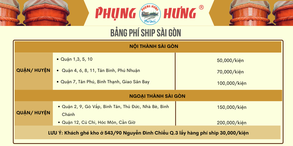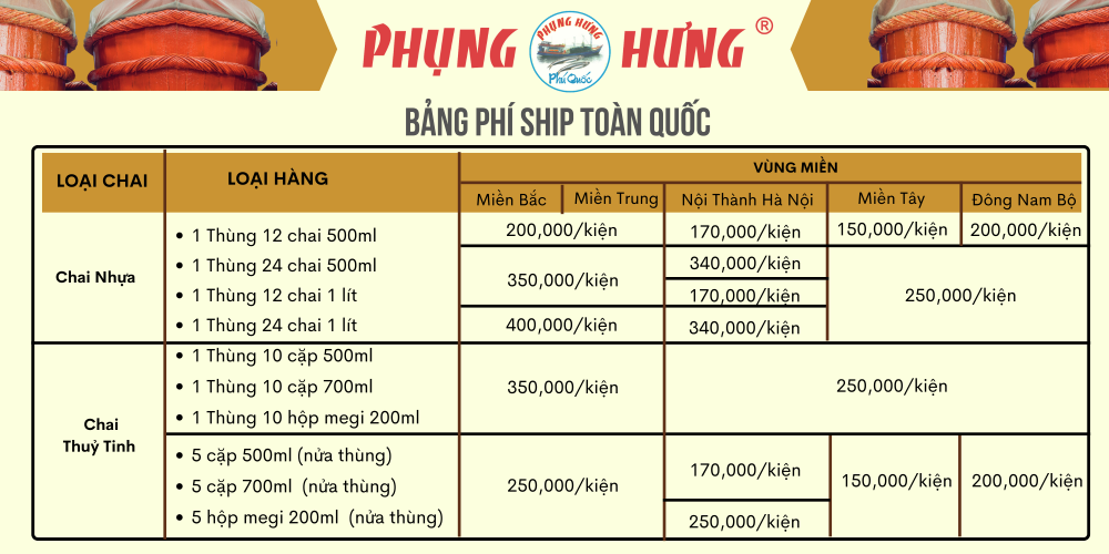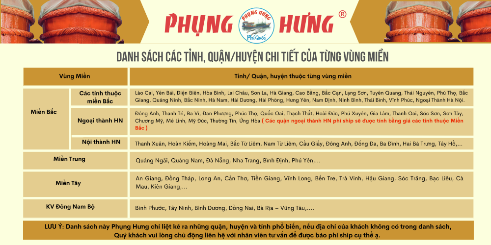 Để phục vụ nhu cầu của khách hàng hiện nay, website Nước Mắm Phụng Hưng vừa thêm vào tính năng "mua hàng" online trên website nhằm tiết kiệm thời gian cho khách khi đặt hàng. Tuy nhiên vì phí ship phụ thuộc vào nhiều yếu tố như vùng miền, loại hàng và số lượng thùng mà khách đặt, nên Phụng Hưng sẽ đính kèm "Bảng Phí Ship" chi tiết và những lưu ý hướng dẫn khách kiểm tra phí ship đến địa chỉ mà khách đã cung cấp để tránh nhầm lẫn có thể xảy ra. Ngoài ra, "Bảng Phí Ship" sẽ kèm với "Danh sách các tỉnh, quận và huyện" thuộc từng vùng miền, để khách dễ dàng dựa vào danh khách và tính tổng phí ship phải trả khi nhận hàng.