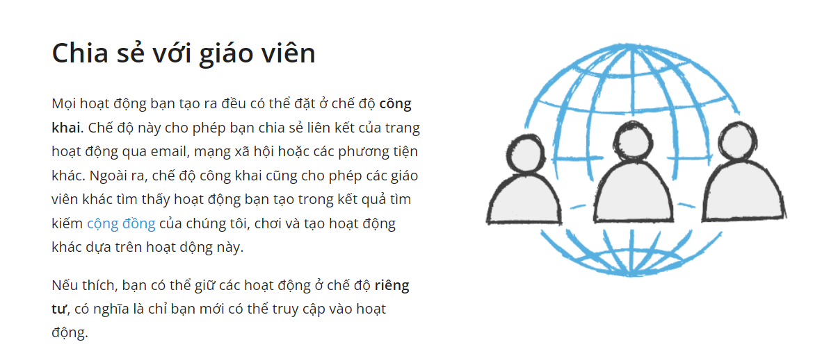 Chia sẻ hoạt động: Người dùng Wordwall có thể chia sẻ hoạt động giáo dục mà họ đã tạo với cộng đồng. Điều này giúp tạo ra một nguồn tài nguyên phong phú, giúp giáo viên khác tìm kiếm và sử dụng các hoạt động sẵn có mà không cần tạo lại từ đầu.
