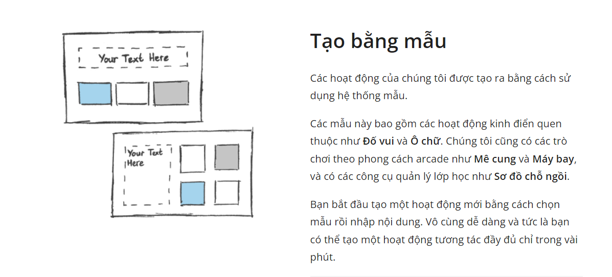 Tùy chỉnh hoạt động: Giáo viên có thể tùy chỉnh các hoạt động theo nhu cầu riêng của lớp học. Họ có thể thay đổi nội dung, màu sắc, hình ảnh, âm thanh và cấu trúc của hoạt động để phù hợp với mục tiêu giảng dạy.