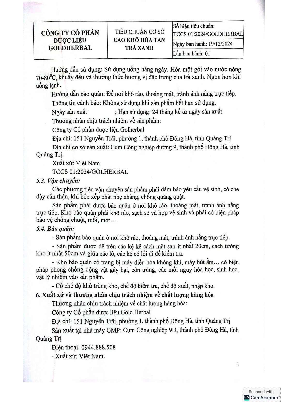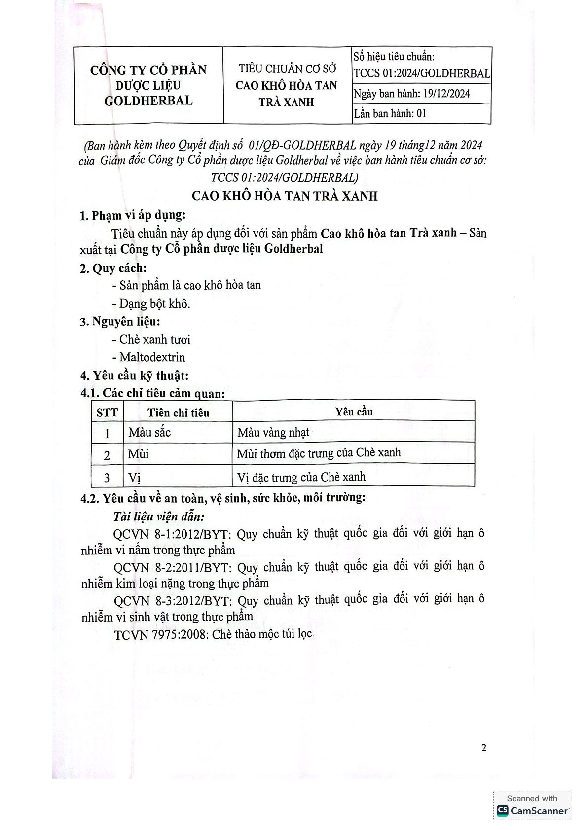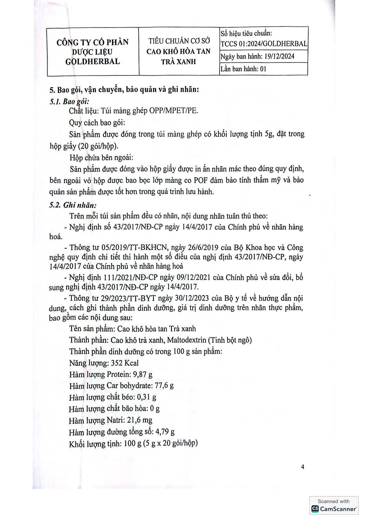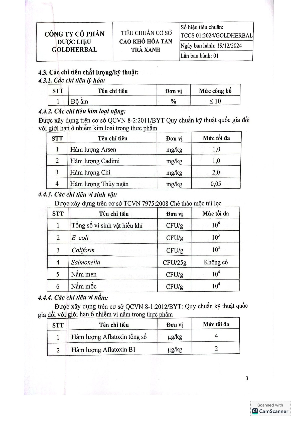Tiêu Chuẩn Cơ Sở Cao Khô Hòa Tan Trà Xanh - Gold Herbal