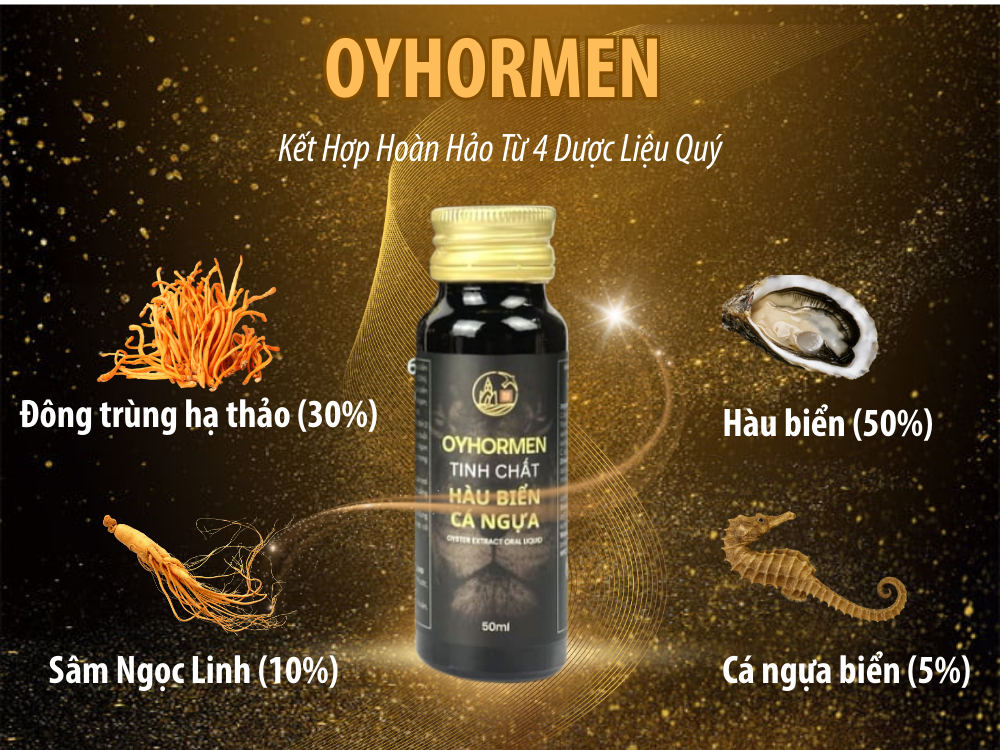 Sản phẩm kết hợp các dược liệu quý như hàu biển, đông trùng hạ thảo và sâm Ngọc Linh, giúp tăng cường sức khỏe, cải thiện sinh lý và thể trạng. Với dạng uống tiện lợi, OYHORMEN phù hợp cho nam giới từ 25-50 tuổi, giúp chăm sóc sức khỏe một cách chủ động và an toàn, không cần phụ thuộc vào thuốc hay giải pháp tức thời.