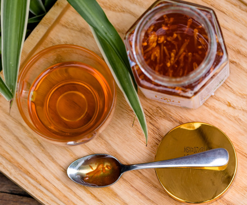 - Cho Đông trùng hạ thảo vào bình/lọ và đổ mật ong vào Đông trùng hạ thảo.