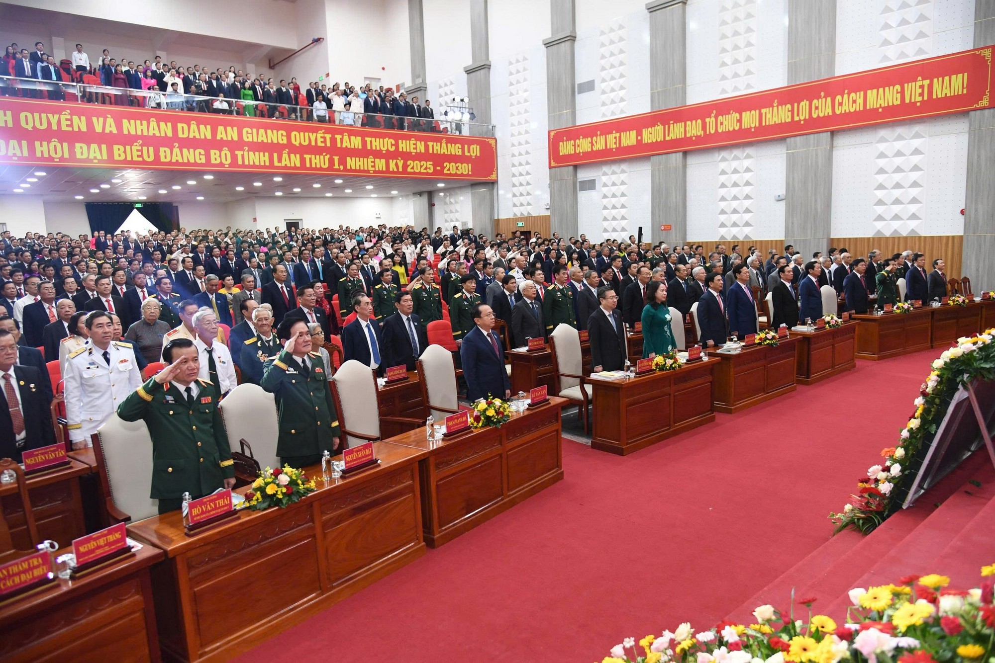 Các đại biểu thực hiện nghi lễ chào cờ tại Đại hội đại biểu Đảng bộ tỉnh An Giang lần thứ I, nhiệm kỳ 2025 – 2030