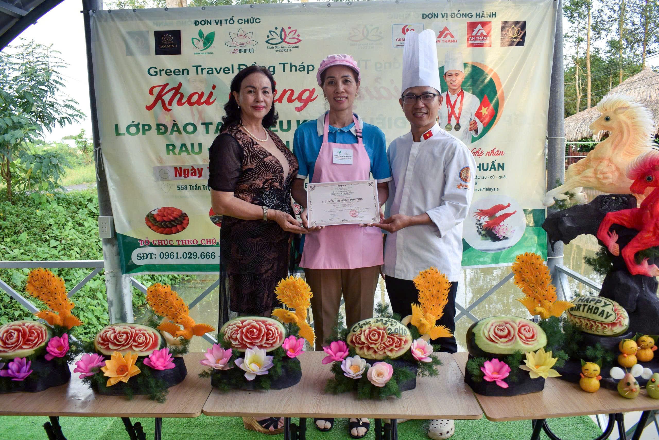 Học viên nhận chứng chỉ đào tạo từ đại diện công ty Green Travel Đồng Tháp