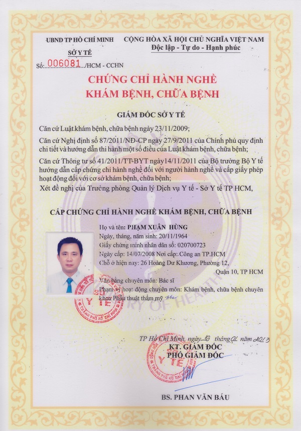 Chứng chỉ hành nghề khám chữa bệnh của bác sĩ Phạm Xuân Hùng