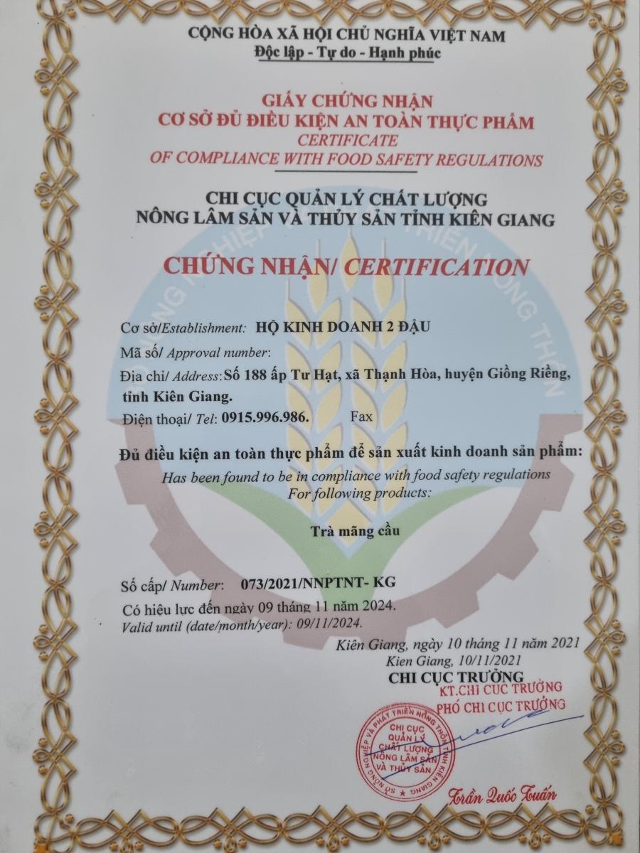 Trong năm 2021, sản phẩm "Trà mãng cầu xiêm 2 Đậu" đã được chọn là Sản phẩm Công nghiệp Nông thôn Tiêu biểu cấp Huyện, và đạt chứng nhận sản phẩm OCOP 3 sao cấp tỉnh.