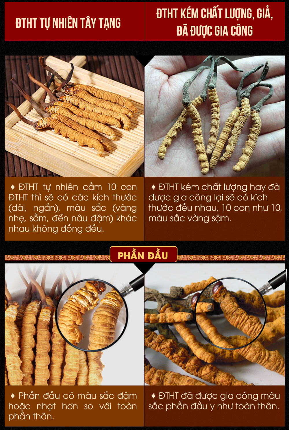 - Đông trùng hạ thảo Tây Tạng là sản phẩm có giá thành rất cao, vì vậy để bảo vệ bản thân không bị rơi vào tình trạng tiền mất, tật mang bạn hãy trang bị cho mình những kiến thức cơ bản hữu ích để có thể phân biệt đông trùng hạ thảo thật - giả bằng mắt thường.
