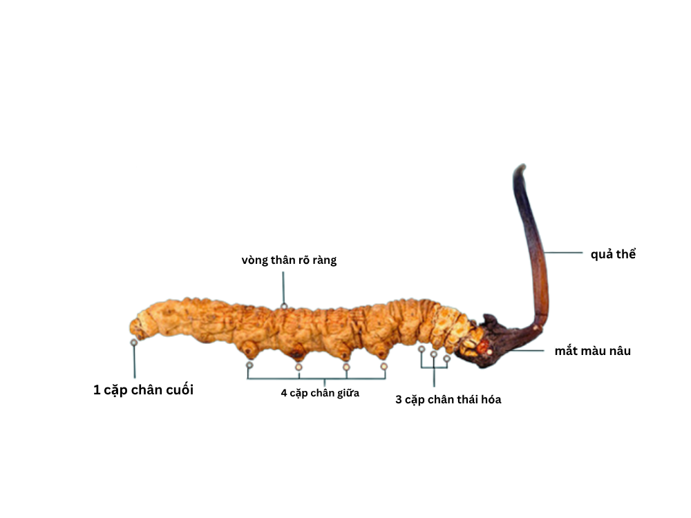Hình dạng của đông trùng hạ thảo tươi và khô có phần thân của con sâu dài khoảng 3 – 5cm, phần đuôi là một nhánh nấm dài khoảng 4 – 11cm. Chính vì hình dáng này, mà nhiều người vẫn thường tự hỏi không biết đông trùng hạ thảo là cây hay con.