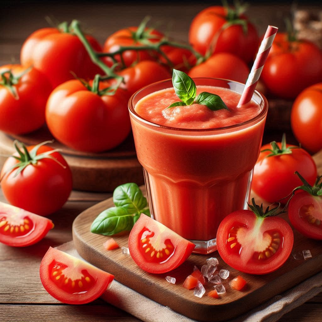 Cà chua bạn rửa sạch với nước muối loãng, sau đó cắt đôi, bỏ phần hạt, cho cà chua và đá viên vào máy xay sinh tố, có thểm thêm cùng các nguyên liệu khác để tăng hương vị như chuối, dứa, cà rốt...