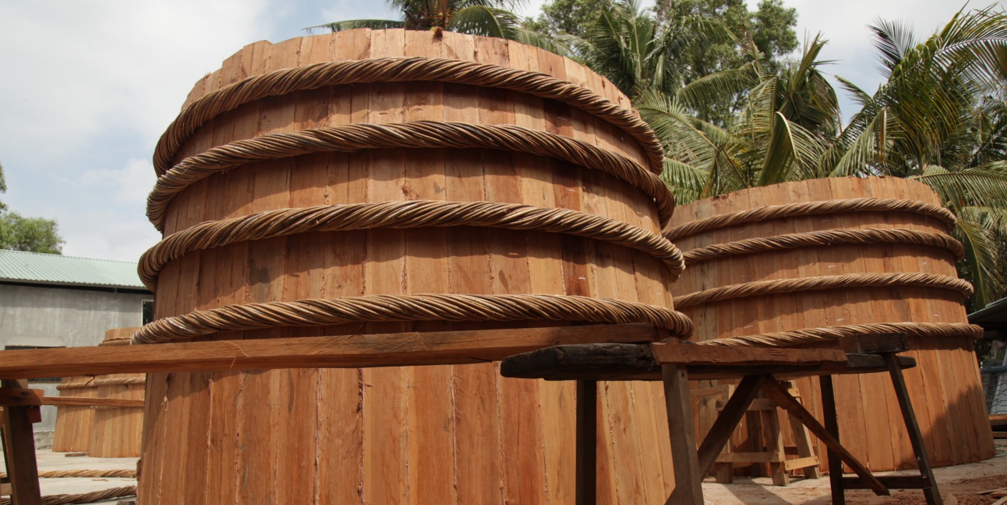 Các thùng gỗ được sắp xếp trong các gian nhà kín đảm bảo môi trường, nhiệt độ ổn định, tạo điều kiện để ủ chượp và lên men đúng quy trình.