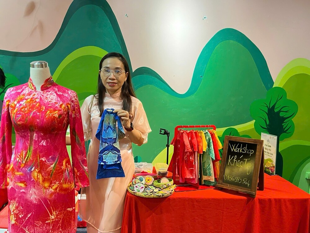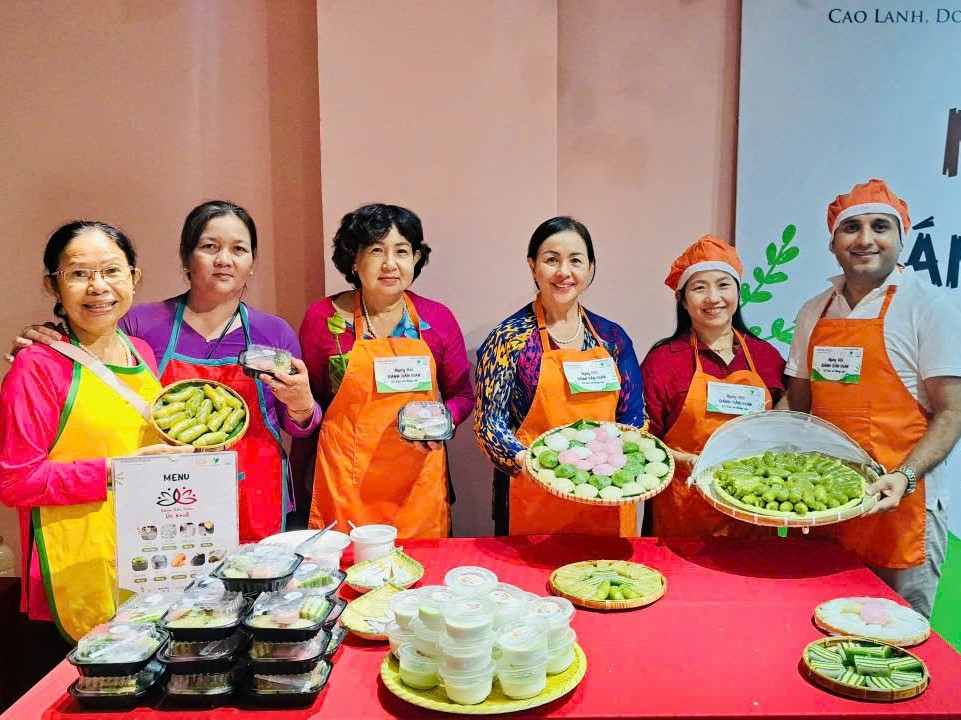Du khách nước ngoài trải nghiệm làm bánh tại Ngày hội bánh dân gian từ sen và nông sản