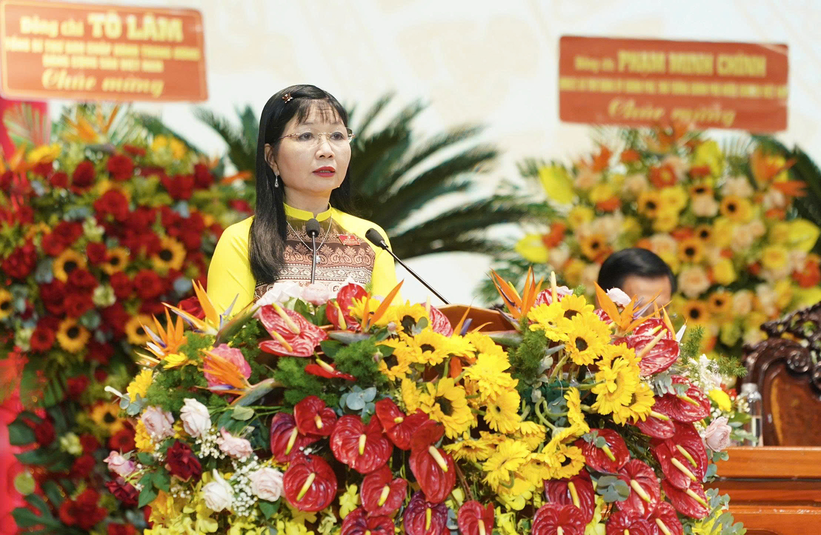 Phó Bí thư Tỉnh ủy, Trưởng đoàn Đại biểu Quốc hội đơn vị tỉnh An Giang, Chủ tịch Ủy ban Mặt trận Tổ quốc Việt Nam tỉnh Trần Thị Thanh Hương trình bày tóm tắt báo cáo tổng hợp ý kiến đóng góp của cán bộ, đảng viên và Nhân dân đối với dự thảo văn kiện trình Đại hội đại biểu toàn quốc lần thứ XIV của Đảng; dự thảo văn kiện Đại hội đại biểu Đảng bộ tỉnh lần thứ I, nhiệm kỳ 2025 - 2030.