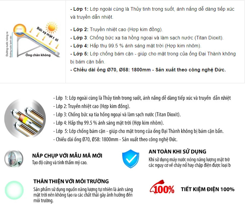 Máy nước nóng năng lượng mặt trời Đại Thành an toàn, hiện đại và thân thiện môi trường.Sản phẩm với thiết kế độc đáo nhờ nguyên lý hoạt động dựa trên sự đối lưu tự nhiên. Quá trình hấp thu nhiệt mạnh mẽ nhờ tận dụng dàn ống thủy tinh chân không chắc chắn, bền vững. Phần lớp phủ sơn gam màu tối giản giúp làm tăng khả năng hấp thụ mạnh mẽ hơn. Bức xạ mặt trời sẽ làm nước nóng lên. Theo đó, nước nóng có tỉ trọng nhỏ, nước lạnh có tỉ trọng lớn hơn. Vì vậy nước nóng sẽ đi xuống, nước lạnh sẽ đi lên tạo thành vòng tuần hoàn liên tục cho đến khi nước trong bình đạt được nhiệt độ nhất định.Cấu tạo của máy nước nóng năng lượng mặt trời Đại Thành Máy năng lượng mặt trời Đại Thành được cấu tạo từ các bộ phận: Bình bảo ôn, dàn ống thủy tinh hấp thu nhiệt, chân máy thế hệ mới. Ruột bình bảo ôn được sản xuất từ chất liệu inxo SUS - 304 chống gỉ sét cao cấp tạo nên độ bền chắc chắn.Lớp bảo ôn là lớp giữ nhiệt bằng hợp chất Foam đảm bảo khả năng giữ nhiệt độ lên đến 120 giờ.Chân máy thế hệ mới bằng inox đảm bảo ống thủy tinh được giữ chắc chắn vào thân máy.