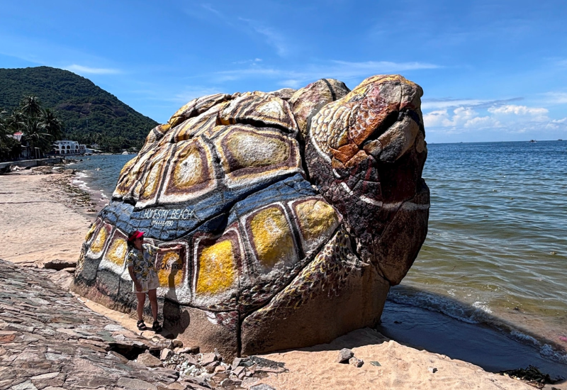 Tảng đá tự nhiên được vẽ thành hình rùa biển là điểm checkin nổi tiếng ở Hòn Sơn. Ảnh: Tuệ An