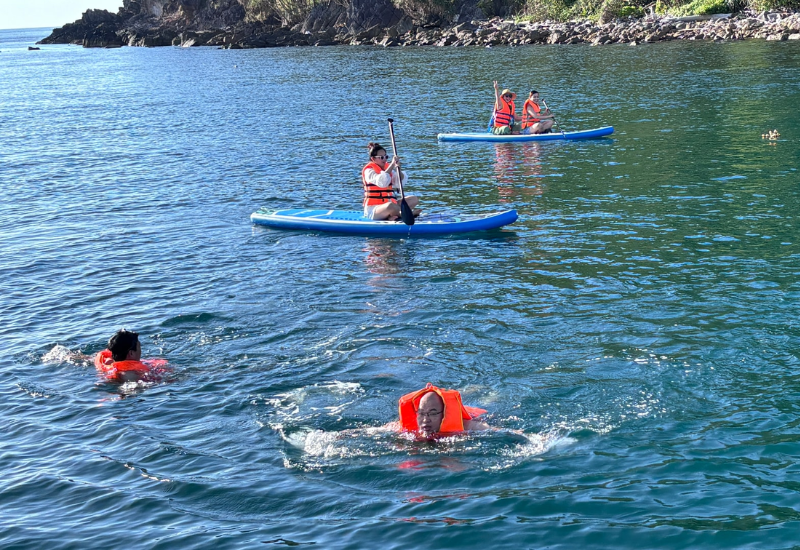 Chiều xuống, cả đoàn theo tàu du lịch đi khám phá biển, thỏa sức bơi lội, lặn ngắm san hô với đàn cá đủ màu; dập dềnh trên bè cá giữa biển trong ánh hoàng hôn nhuộm đỏ chân trời để thưởng thức một bữa tối khó quên…