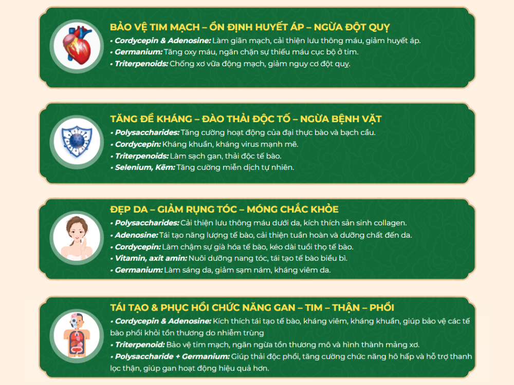Cordycepin & Adenosine: Giãn mạch, cải thiện lưu thông máu, ổn định huyết áp.