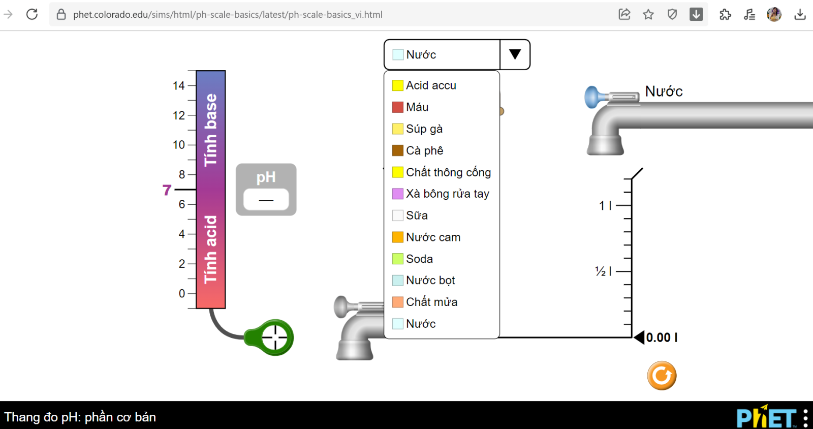 Ví dụ: Mô phỏng thang đo pH của các loại dung dịch khác nhau (môn Hóa học)