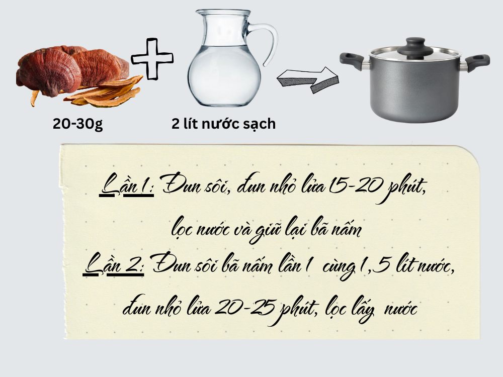 - Cho 20-30g nấm linh chi đã sơ chế vào nồi cùng 2 lít nước sạch.