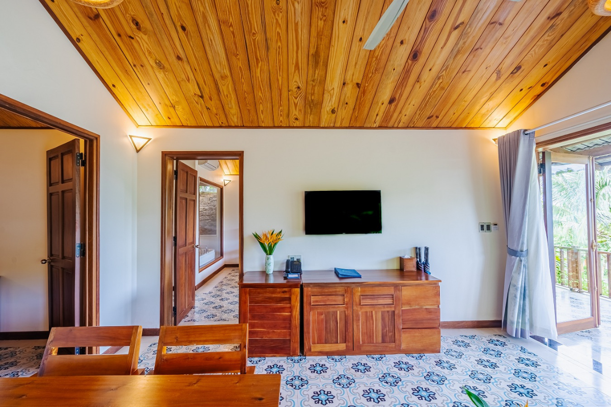 Villa Garden View ẩn mình giữa khu vườn nhiệt đới xanh mát, mang đến không gian nghỉ dưỡng rộng rãi 65m², nơi bạn hòa mình vào thiên nhiên trong sự riêng tư tuyệt đối. Khu vực tiếp khách với ghế sofa đầy màu sắc là nơi lý tưởng để thư giãn cùng tách trà hoặc cuốn sách yêu thích. Villa Garden View là điểm dừng chân hoàn hảo để tận hưởng sự yên bình của thiên nhiên trong không gian tiện nghi và sang trọng.