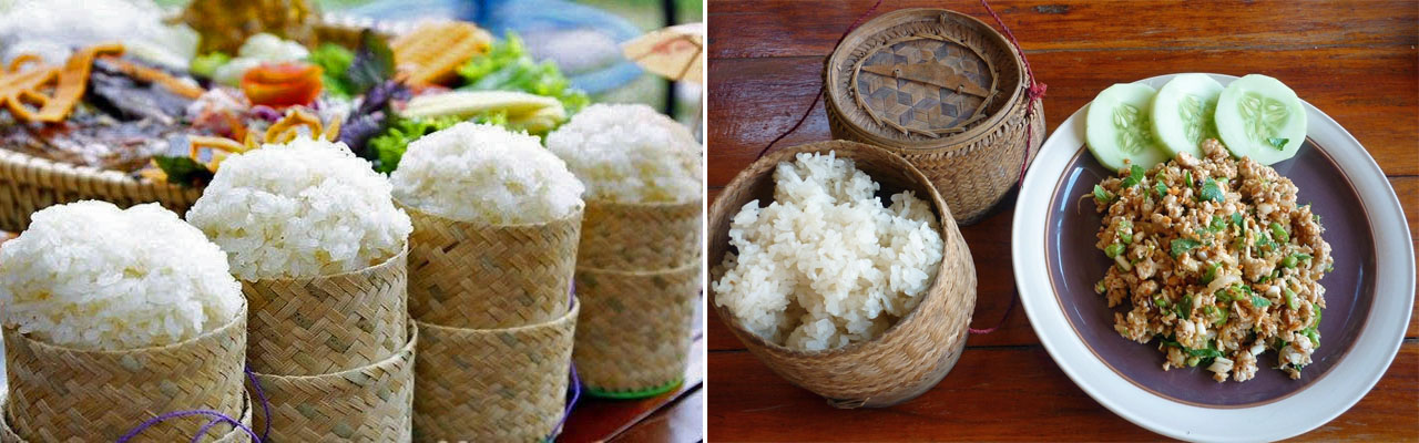 Lúa gạo rất được trân trọng ở Lào. Người Lào đặc biệt thích ăn gạo nếp (khao nyao) dù rằng gạo tẻ (khao chao) và bún gạo (khao poon) cũng rất phổ biến. Các thành viên trong gia đình ăn cơm từ một cái thố chung hoặc dùng riêng mỗi người một bát. Cơm nếp thì người ta ăn bốc bằng tay. Người ăn sẽ nắm cơm thành từng viên nhỏ, và sau đó dùng nó như cái thìa để vét và lùa thức ăn trên đĩa vào miệng, hoặc chấm vào nước chấm.