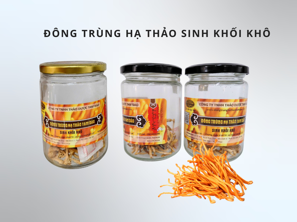 Đông trùng hạ thảo sinh khối khô là sản phẩm dược liệu quý, giàu dưỡng chất, dễ bảo quản và sử dụng hàng ngày để bồi bổ sức khỏe.Được nuôi trồng từ Cordyceps militaris, đông trùng sinh khối khô chứa cordycepin và adenosine giúp tăng đề kháng, chống mệt mỏi, lão hóa.