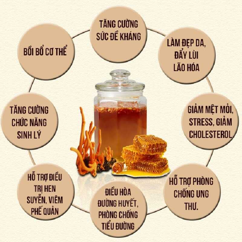 Bởi là sự kết hợp của giữa hai dược liệu quý nên mật ong Đông Trùng Hạ Thảo mang đến nhiều công dụng: